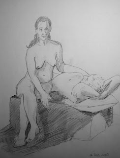 L'atelier du 16 décembre 2010 fut particulièrement intéressant. Nous avons eu la chance d'avoir un couple comme modèle! C'est tout un défi, car la marge d'erreur est moins grande. Lorsqu'on dessine seulement un modèle, si le dessin est plus ou moins fidèle, ça ne saute pas aux yeux à première vue, mais lorsqu'il y a deux modèles, alors là ça se complique un peu! Toutes les formes sont inter-reliées entre elles, donc si une des formes n'est pas juste, ça se répercute sur le reste du dessin.
